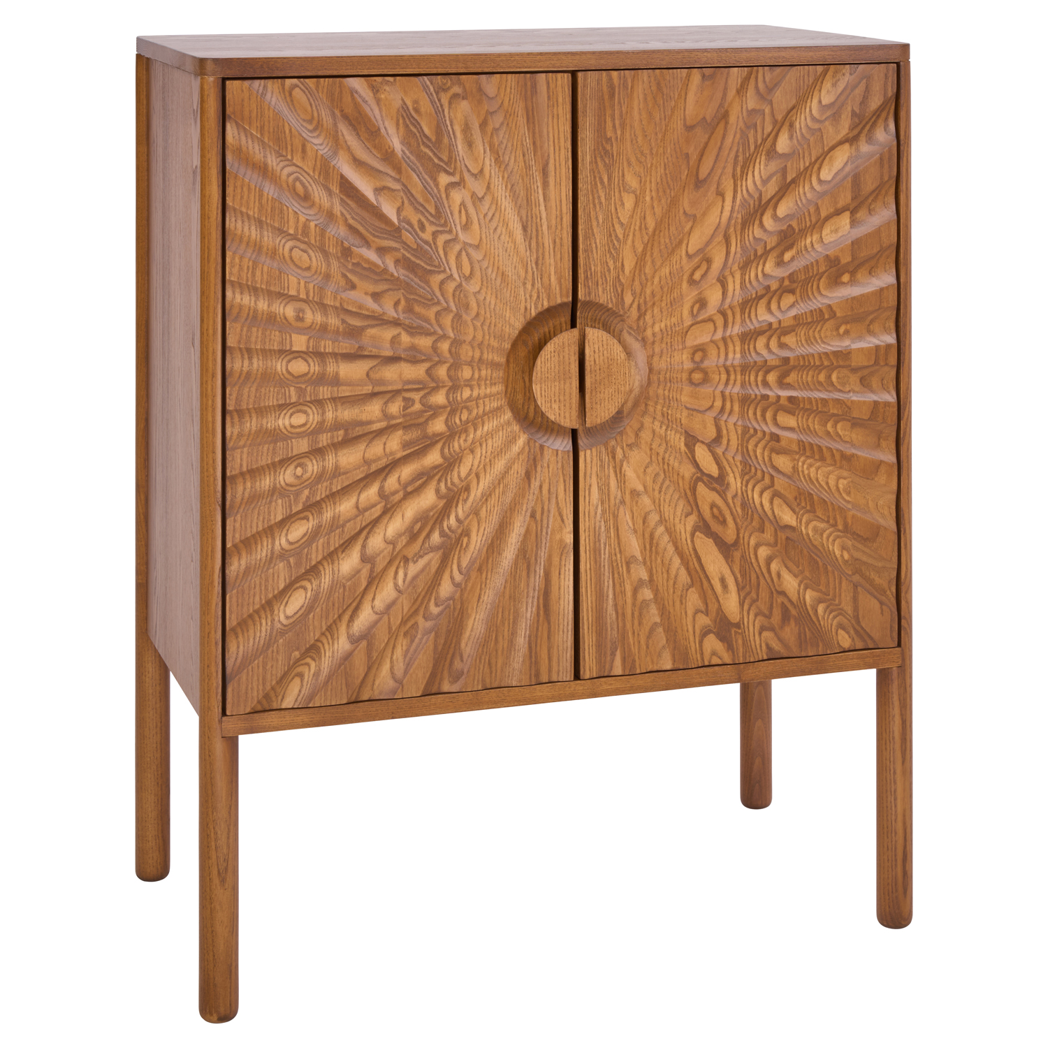 A beautiful statement piece, the elegant Ibstone cabinet has the softly sculpted outlines and refinement that have always been ercol hallmarks. The bold ‘sunburst’ pattern is cut into the solid ash doors for a subtle three-dimensional effect, with a central disc handle set in a gently dished recess. Each individual piece has its own unique quality and look, reflecting the beauty and variety of natural wood grain, meaning no two pieces are exactly alike. ercol continues to support Grown in Britain to ensure that our British ash is responsibly and sustainably grown. This Ibstone cabinet is made from British-Certified ash timber and supplied fully assembled, it’s available in all ash finishes.